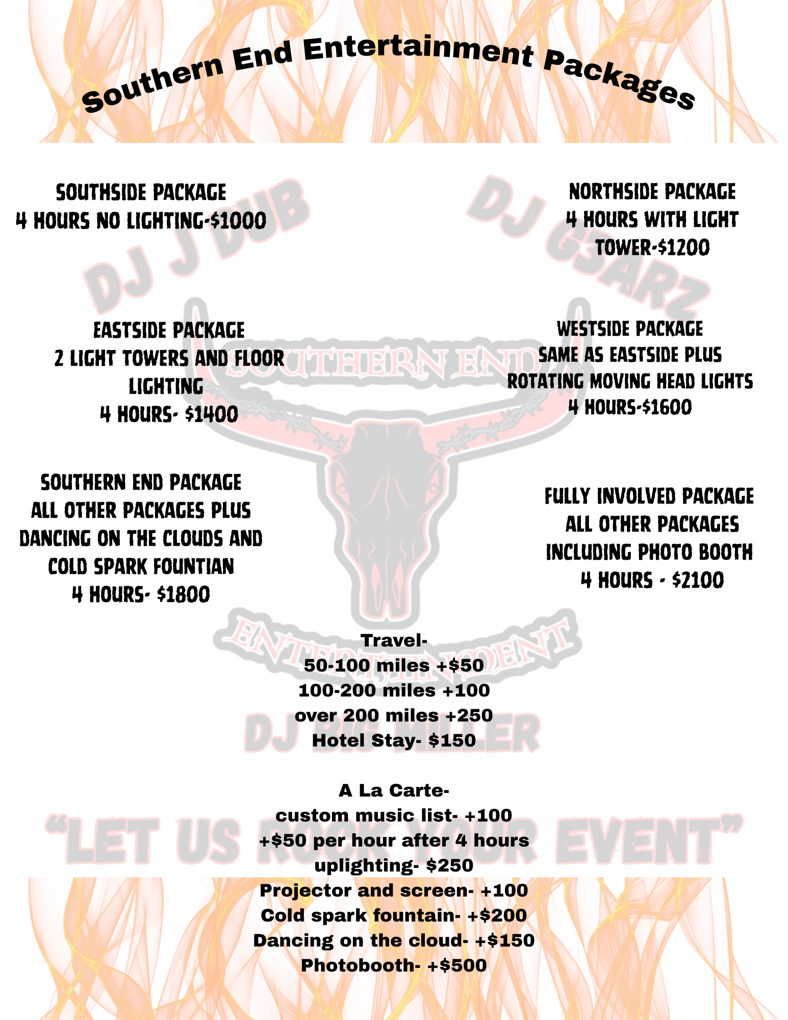 Southern End Entertainment is our DJ division. We have 3 experienced DJs, DJ Big Miller, DJ JDub, and DJ G3earz, who will work with you to match the music to your event perfectly. All of our DJs will help you create the perfect playlist and make sure that you have an amazing experience. Book Southern End Entertainment today and get the Fully Involved Events Experience.